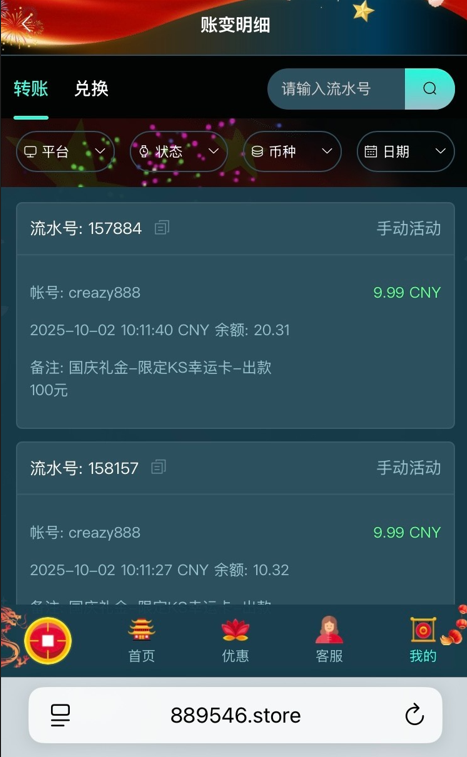 免费羊毛党 【幻影娱乐】有号的去看看国庆礼金9.99 到账情况:自测【充值后果自负】 领取方式:有号的去看看国庆礼金9.99 安全系数:低 平台资历:未知 会员评分:★☆☆☆☆ 申领网址:http://20360.cc/ 提现要求:最低提现额度为100元 图例介绍